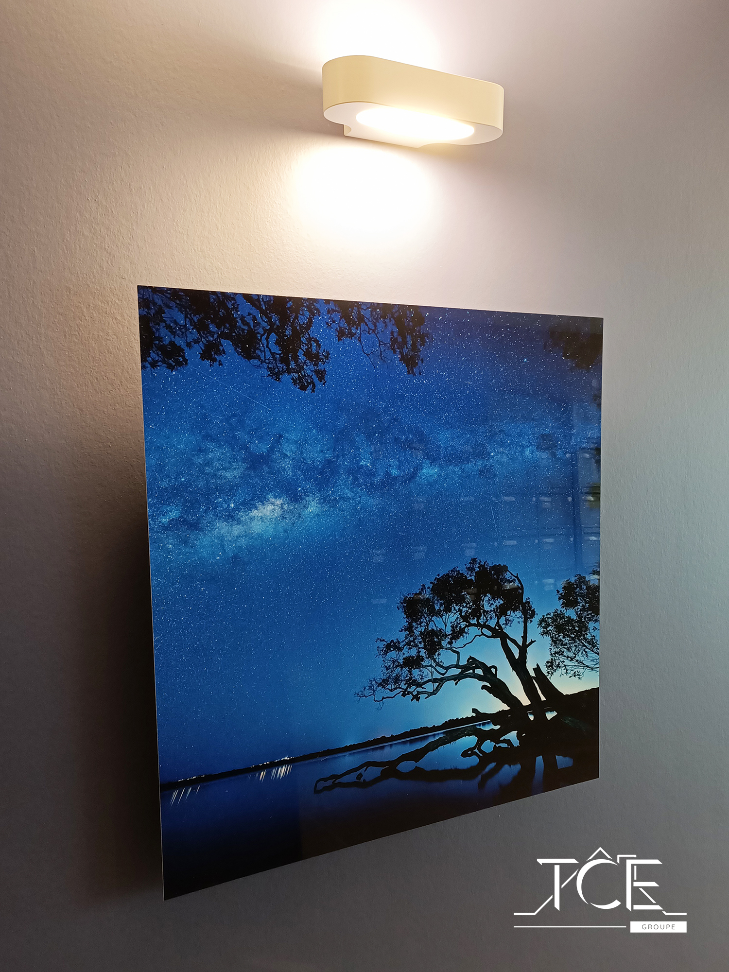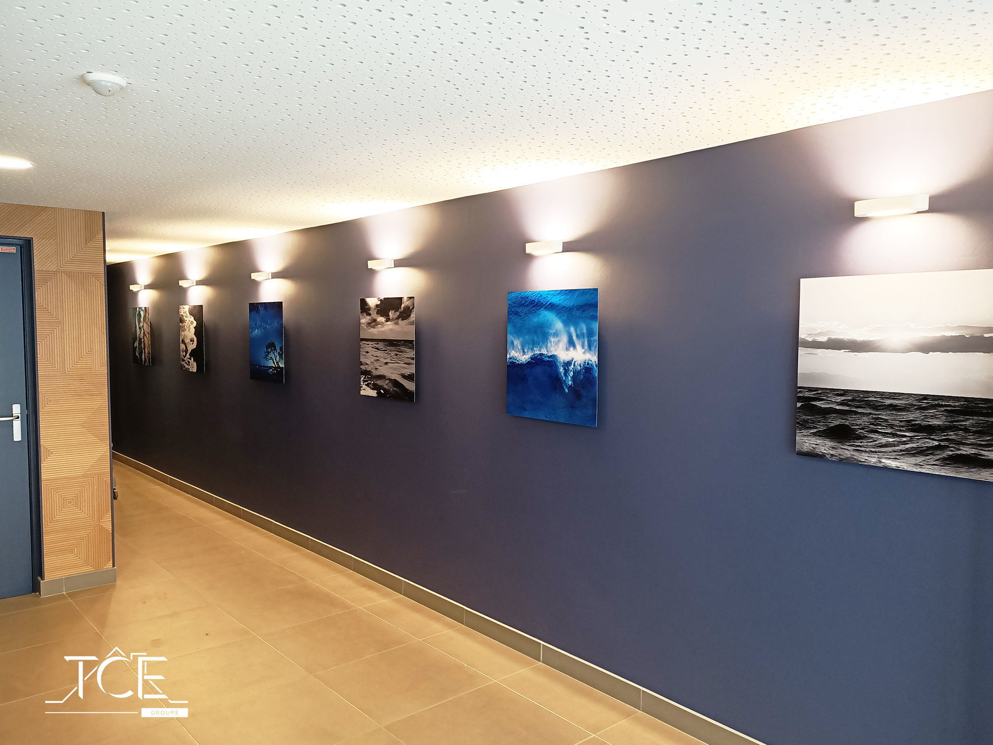 Particularité du projet : Les tableaux ont été fournis et posés par nos soins. Les appliques murales LED posées au-dessus des tableaux apportent une touche décorative à l’ensemble.