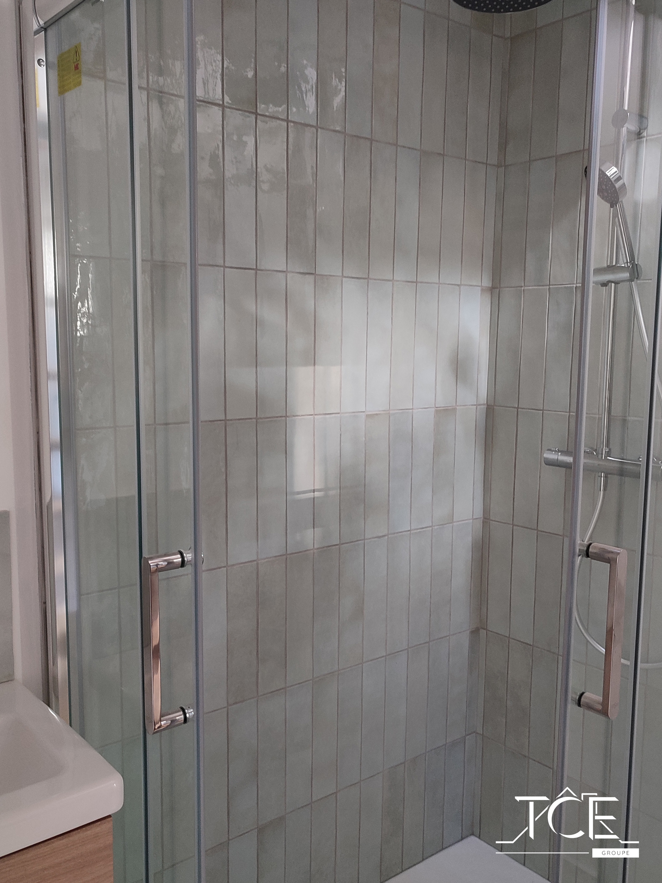 - Il a été nécessaire de créer une salle de douche supplémentaire : Installation d’une douche avec portes en verre, création de sa paroi en faïence, et pose d’un petit meuble avec sa vasque et un wc. Pour la seconde salle de bain, elle reprend les mêmes matériaux que la précédente, celle-ci ayant une nouvelle baignoire et un lavabo plus grand. L’intégralité de la plomberie a été revue.