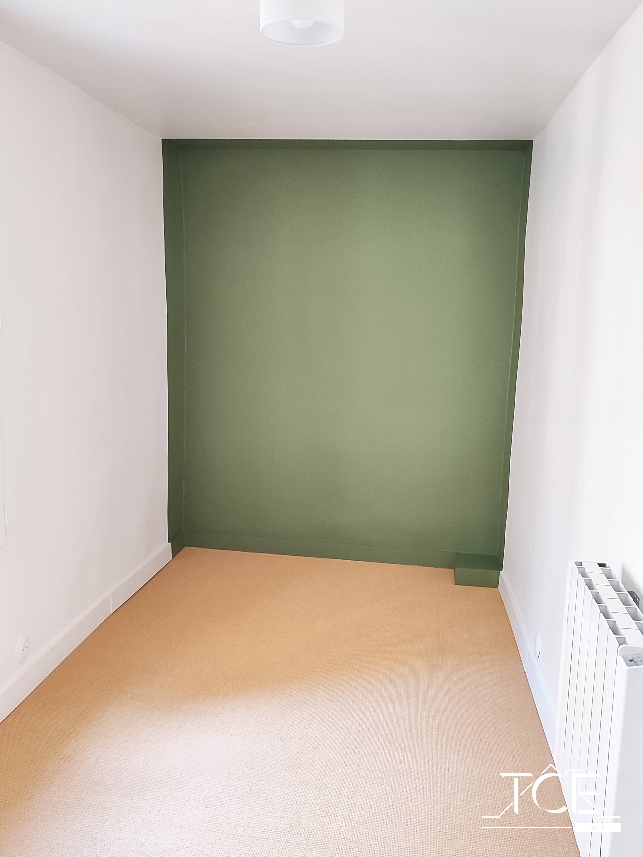 - Peinture : Tous les murs ont été repeints en blanc. Le vestibule bénéficie d’une peinture bleue de chez Tollens pour amener de la couleur dès l’entrée. Une peinture verte a été choisie pour le mur de l’une des chambres. Les poutres apparentes apportent beaucoup de cachet au logement, nous avons peint certaines poutres en blanc et d’autres en gris pour valoriser cette architecture typiquement normande.