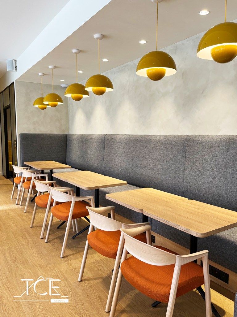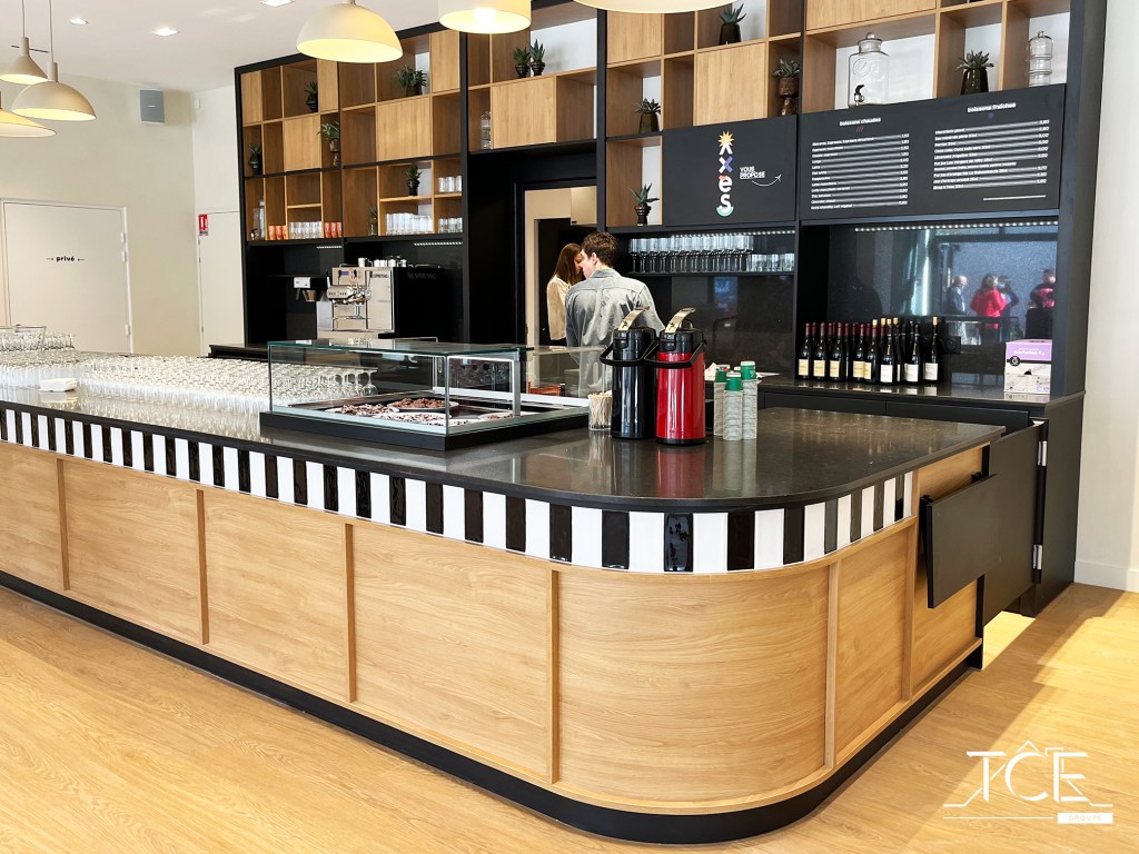 Un espace détente a été pensé par notre client, idéal pour profiter d’un café ou d’un repas tout en travaillant. Un bar et des banquettes ont été fabriqués pour cette occasion.