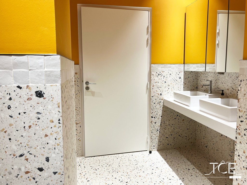 - Le sol ainsi que la partie basse des murs ont été recouverts avec un revêtement effet “pierre” de chez Terrazzo.
