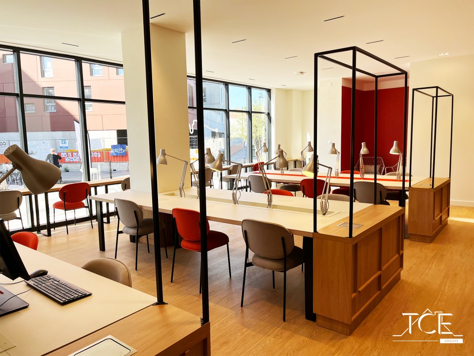 - Installation de grandes tables de travail au centre de la pièce. Des trappes passe câble sont situées au centre du plateau de table. Nous avons amené l’électricité jusqu’au mobilier tout en cachant subtilement le câblage via les pieds de table.