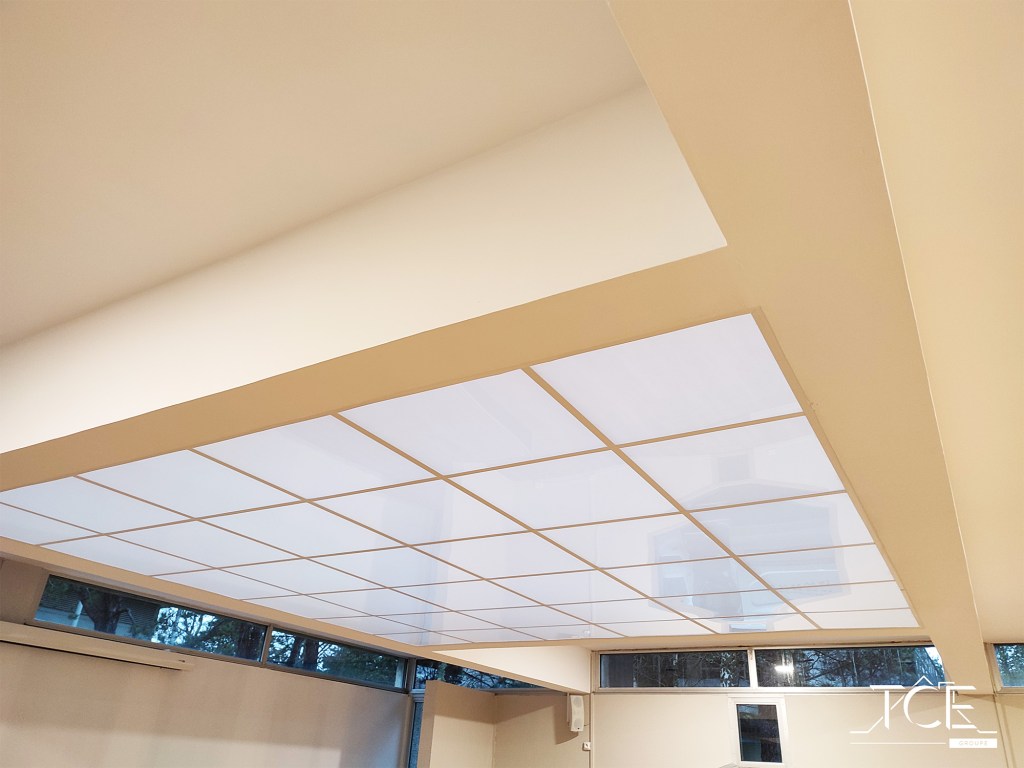 Verrière et puits de lumière : La particularité de cet espace est la présence d’un Sky Dome amenant la lumière extérieure directement dans la pièce. La solution trouvée pour gagner en efficacité énergétique tout en gardant la lumière du dôme a été de poser des dalles en polycarbonate semi opaque. L’opacité des dalles permet la diffusion d’un éclairage naturel et tamisé. Un bandeau LED a également été installé en périphérie de la verrière pour mettre en valeur cet élément.