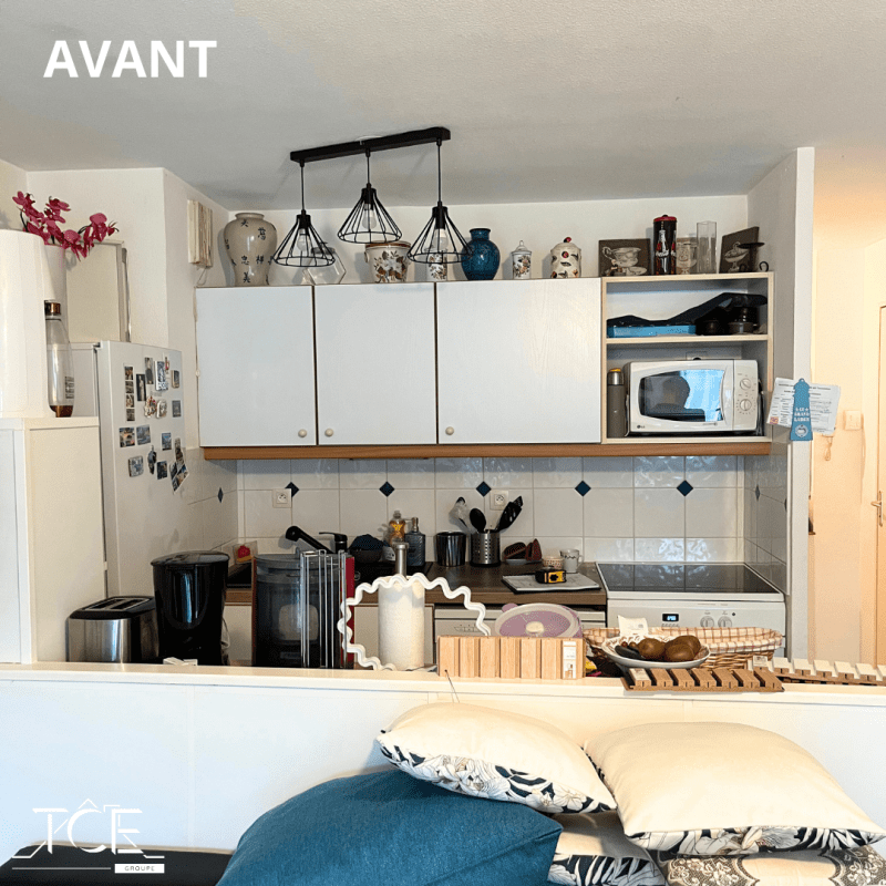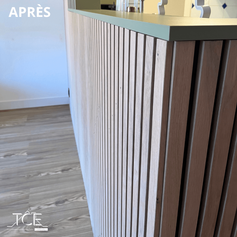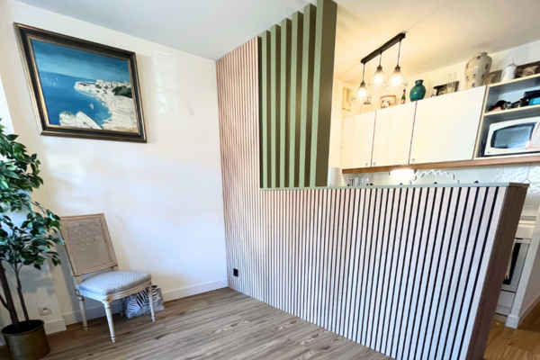 Pour structurer visuellement l’espace tout en conservant une impression d’ouverture, une élégante cloison en bois a été imaginée et installée. Elle sépare subtilement la cuisine du reste du séjour et devient la pièce maîtresse du lieu, apportant à la fois caractère et fonctionnalité.